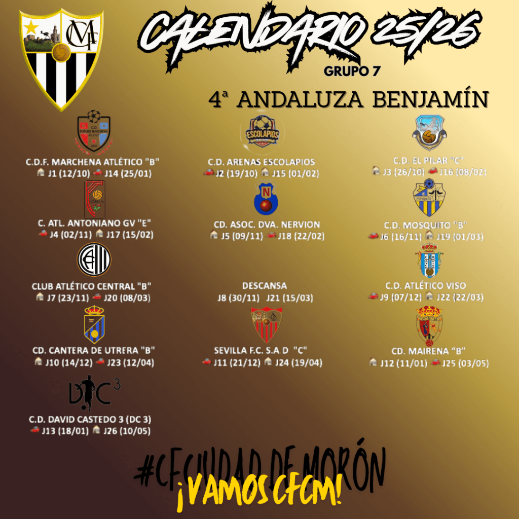 #CFCiudadDeMorón #BenjamínC25_26 #4ªAndaluza #Calendario #FútbolBase #OrgulloCiudad #BlancoYNegro