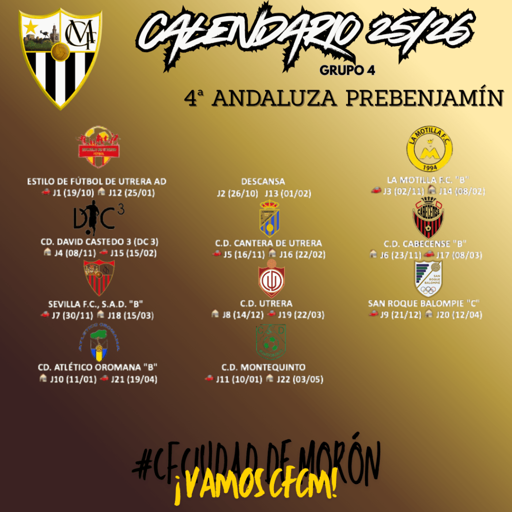 #CFCiudadDeMorón #PrebenjamínC25_26 #4ªAndaluza #Calendario #FútbolBase #OrgulloCiudad #BlancoYNegro